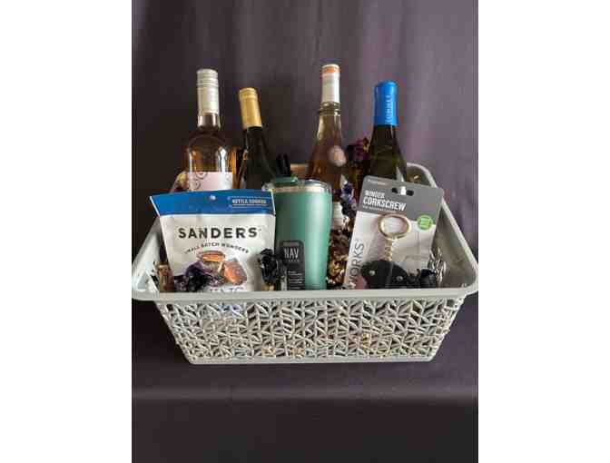4 bottles wine are included in this fabulous basket: Mouton Cadet, Campillo El Sueno, Sables D'Azur and Sonnet California Chardonnay Corkscrew. But wait...there's more! Also includes Sea Salt Carmels and Nav Tumbler