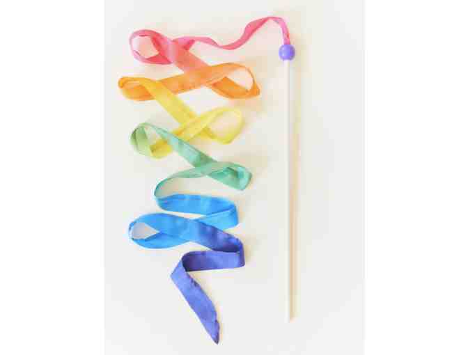 This auction is for TWO Rainbow Streamers from Sarah's Silks. These are 16-inch long birch wood wands topped with a decorative wooden bead, with an 8-foot long x 1-inch wide Rainbow Silk Streamer.