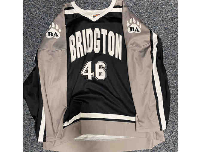 Game-worn black and gray #46 Bridgton Academy hockey jersey with older style BA athletic logo on sleeve.