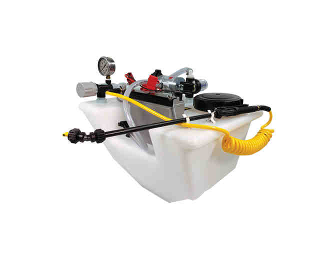 Drop in sprayer with a 9 gallon tank. Battery powered and completely self sufficient when in use. Single boomless nozzle (65" effective spray width) and 15" poly hand wand. Standard with 0-60 PSI regulator for various application purposes. Covers up to 30,000 sq. ft per fill. Compatible with select models of Spyker and Lesco spreaders.