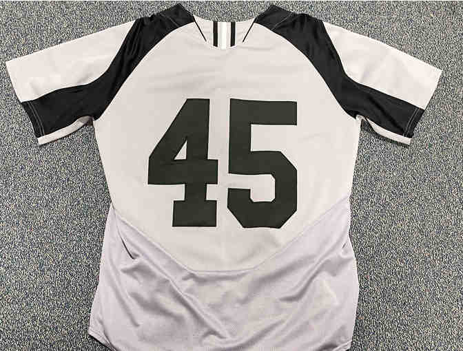 Game-worn gray with black Bridgton #45 baseball jersey.