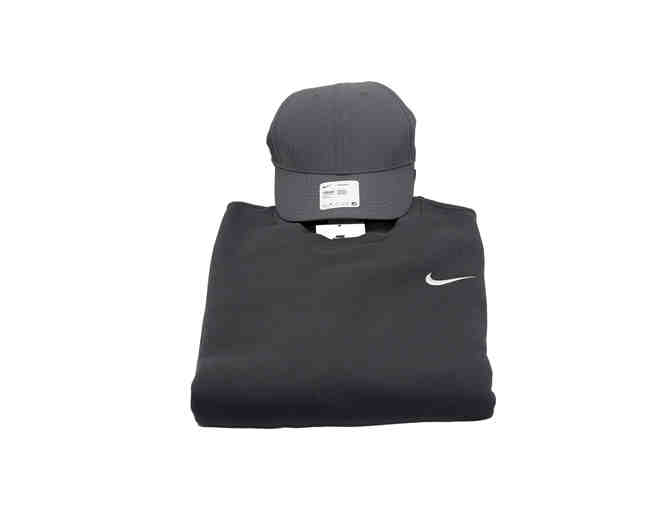 Classic Nike comfort with this basic gray crewneck sweatshirt (Men's S sizing) and a gray Legacy Dri-Fit Cap (unisex sizing). Cap is adjustable and has a light pinstripe pattern (tone-on-tone).