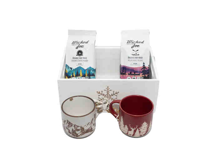 Great organic coffee produced in Maine by Wicked Joe Organic Coffee. This Wicked Joe gift set includes two seasonally decorated coffee mugs and two bags of coffee in a decorative holidy crate.