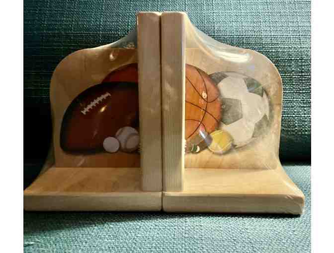 This auction contains a pair of bookends featuring a variety of Sports Balls, donated by Vermont's Own in Middlebury, VT. Solid, hard maple stand to keep books in place! Amazing quality, and and made in Middlebury, VT by Maple Landmark.