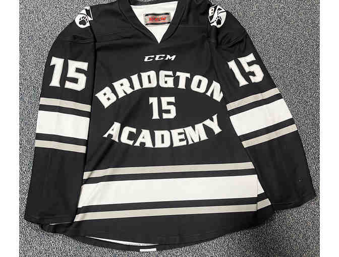 Game-worn CCM Bridgton hockey jersey #15 in black.
