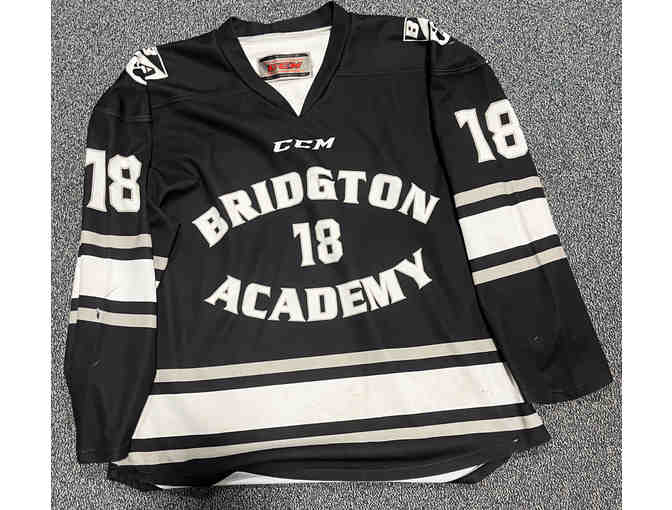 Game-worn CCM Bridgton hockey jersey #18 in black.
