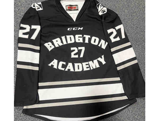 Game-worn CCM Bridgton hockey jersey #27 in black.