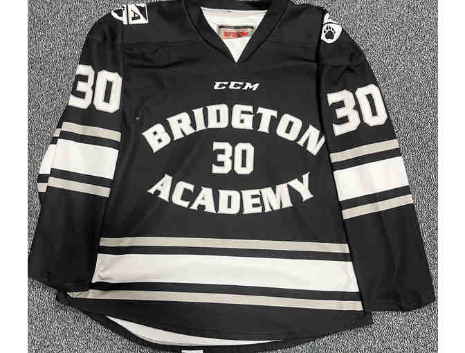 Game-worn CCM Bridgton hockey jersey #30 in black.