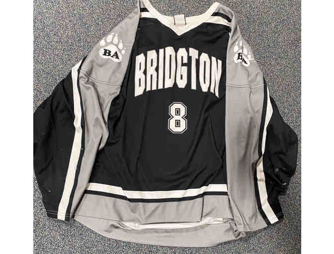 Game-worn black and gray #8 Bridgton Academy hockey jersey with older style BA athletic logo on sleeve.