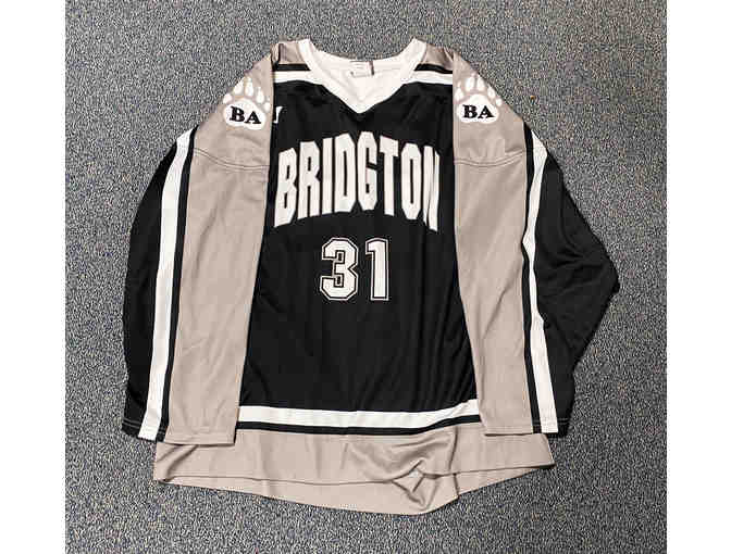 Game-worn black and gray #31 Bridgton Academy hockey jersey with older style BA athletic logo on sleeve.