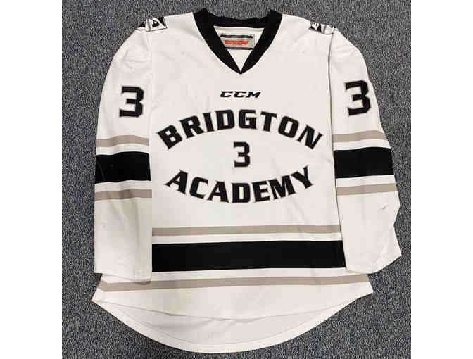 Game-worn white #3 Bridgton Academy hockey jersey.