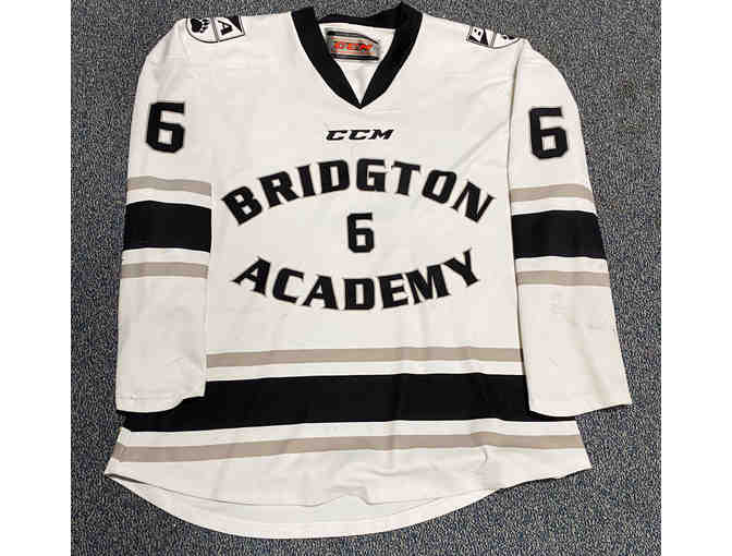 Game-worn white #6 Bridgton Academy hockey jersey.