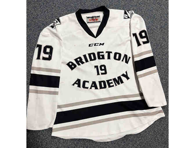 Game-worn white #19 Bridgton Academy hockey jersey.