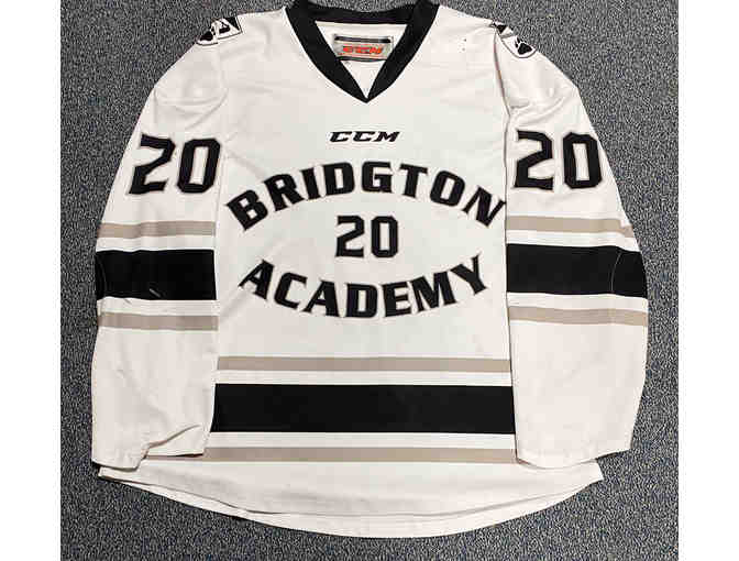 Game-worn white #20 Bridgton Academy hockey jersey.