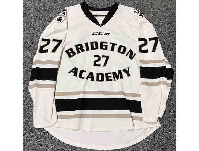 Game-worn white #27 Bridgton Academy hockey jersey.