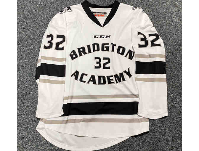 Game-worn white #32 Bridgton Academy hockey jersey.