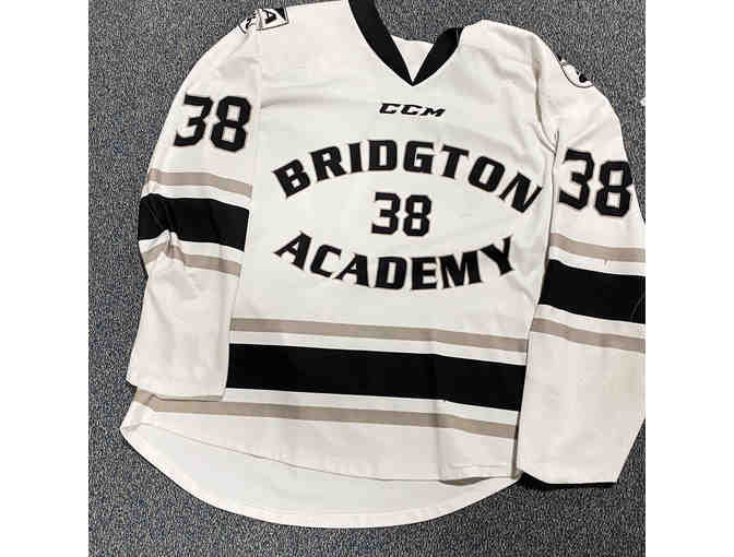 Game-worn white #38 Bridgton Academy hockey jersey.