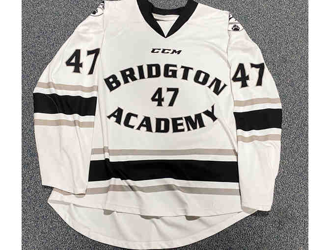 Game-worn white #47 Bridgton Academy hockey jersey.