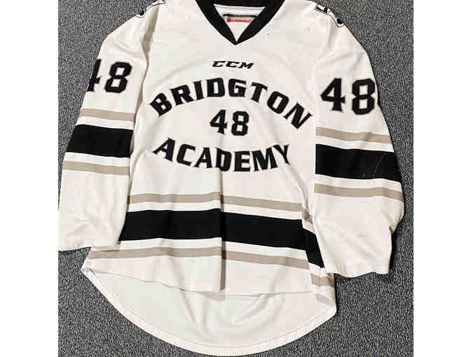 Game-worn white #48 Bridgton Academy hockey jersey.