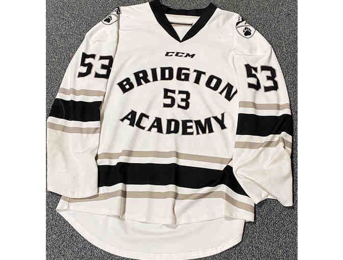 Game-worn white #53 Bridgton Academy hockey jersey.