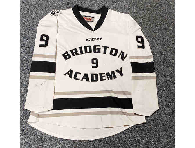 Game-worn white #9 Bridgton Academy hockey jersey.