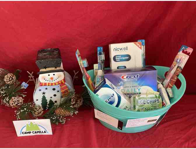 Keep your teeth sparkling white for the holidays with this awesome basket from Fort View Dental. In this basket you will find, 2 adult toothbrushes, 2 childrens toothbrushes, a Nicwell Oral Irrigator, assorted toothpastes and flossers, Ice Chips Candy and Crest 3D white Daily Whitening Serum.