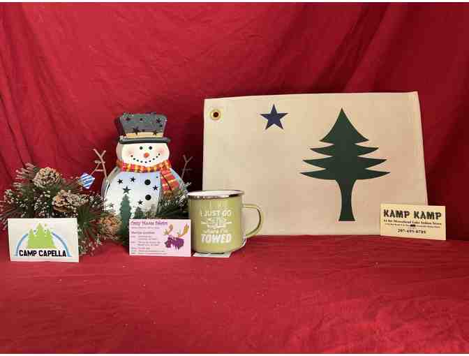Thank you to Crazy Moose Fabrics in Greenville and Kamp Kamp in Greenville for donating this cute Maine Flag and Tin Camper mug to put together for our online auction this year!