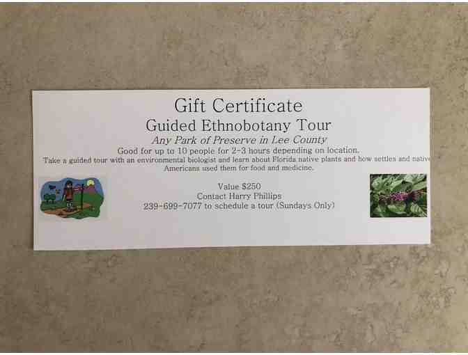 The guided tour is good for up to 10 people for 2 - 3 hours to any park in Lee County. Take a unique guided tour with a envinmental biologist and learn about Florida native plants and learn how settlors and native americans used them for food and medicine.