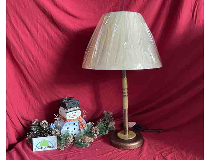 Win this beautiful wooden and copper detailed lamp from Merrill Furniture! This would look great in a reading area where you can curl up and read a good book under the warm glow of the lamp.