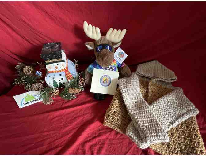 This ones for the little ones! Wrap this up and give it to your favorite little on this holiday season! A warm hand knit tan sweater size 12 mo, $15 Union River Book and Toy Co Gift Certificate and a super soft Cool as a Moose Stuffy, Hermie, for snuggles!