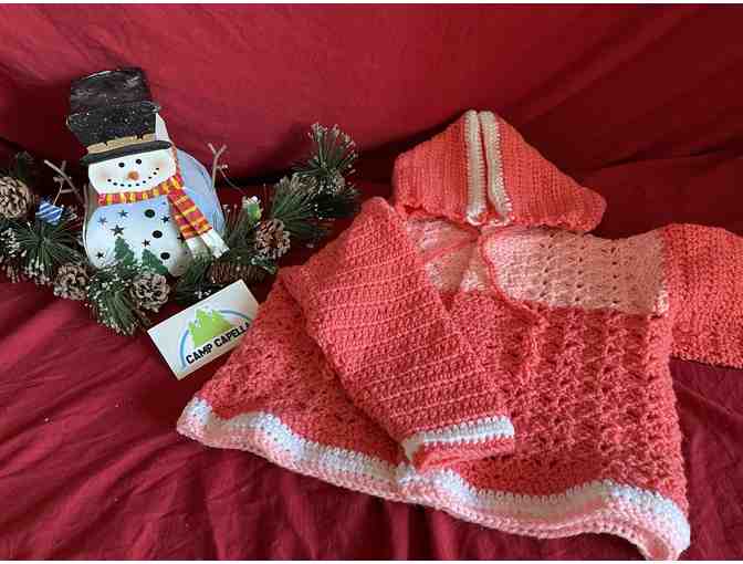 This handmade pink hooded sweater will keep any little loved one nice and warm this winter season.