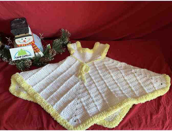 This white and yellow dress is a great addition to any one year olds wardrobe, can be worn as a dress or even a jumper. As this is a handmade item sizing is general.