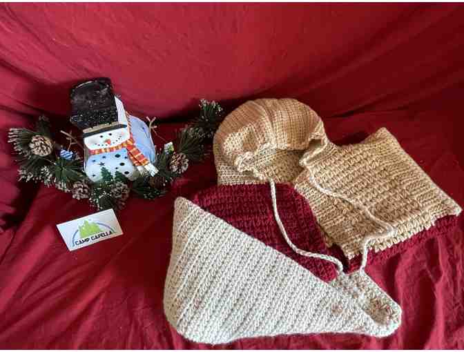 This handmade tan and maroon hooded sweater will keep any little loved one nice and warm this winter season.