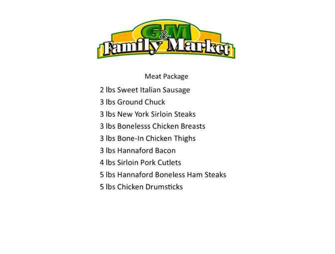 If you are a carnavor at heart then is is the package for you. This Meat Package was genorously donated by G&M Family Market and includes: 2 lbs Sweet Italian Sausage, 3 lbs Ground Chuck, 3 lbs New York Sirloin Steaks, 3 lbs Bonelesss Chicken Breasts, 3 lbs Bone-In Chicken Thighs, 3 lbs Hannaford Bacon, 4 lbs Sirloin Pork Cutlets, 5 lbs Hannaford Boneless Ham Steaks, 5 lbs Chicken Drumsticks.