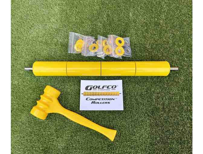 One set of 1 piece of Competition Roller assembly (T2522A2C4) (2" diameter x 22.3" yellow polyurethane smooth roller with 4 independent spinning bodies) including 4 stainless bearing upgrades (BU-COMPSS) and 2 each stainless bearing overhaul kits (OHCOMPSSN4int and OHCOMPSSN4ext) to fit Toro 22" Triflex and Flex21 reel mowers plus 1 yellow polyurethane soft impact mallet (#Mallet1).