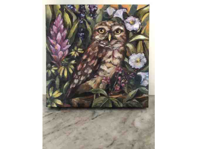 You are bidding on a beautiful original oil on canvas painting by a local artist. The framed painting measures 12 X 12 of a burrowing owl hiding in the flowers. The painting goes around the sides as well.