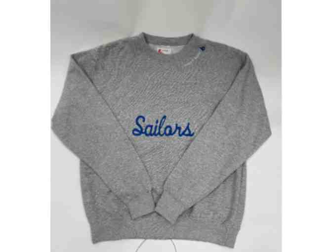 Custom Sailors Sweatshirt. Sailors stiched in blue on the front of a gray sweatshirt with Newport Beach running along the neckline in white stiching.