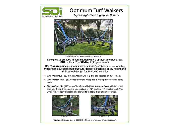 THE SDI Turf Walker 10 walking spray boom is designed to be used with an existing sprayer and hose reel. It features a folding 10 foot spray boom with 12 drip free nozzles on 10-inch centers. Each boom section can be operated individually. There is an included speedometer.