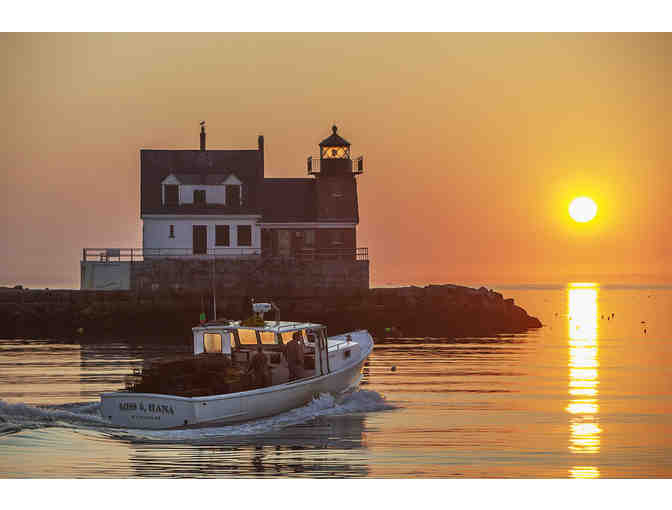 A beautiful 17" x 22" print by renowned Maine photographer Peter Ralston, Going features the lobster boat Miss Hana passing by the Rockland Breakwater Lighthouse at sunrise.