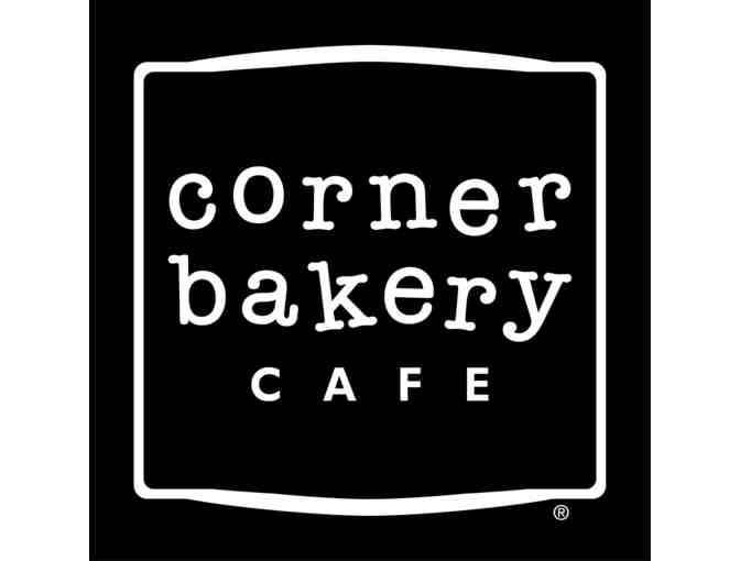 Basket with $25 gift card to Corner Bakery Cafe, 1 Large Cinnamon Creme Cake voucher, 2 Corner Bakery branded mugs, 6 teabags