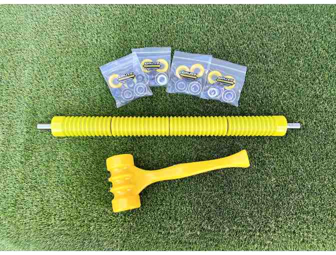 One set of 1 piece of Competition Roller assembly (T2522A2NGF4) (2"x22.3" yellow polyurethane narrow grooved 4 body roller with flat ends) including 4 bearing overhaul kits to fit front of Toro 22" Triflex and Flex21 reel mowers plus 1 yellow polyurethane soft impact mallet (#Mallet1).