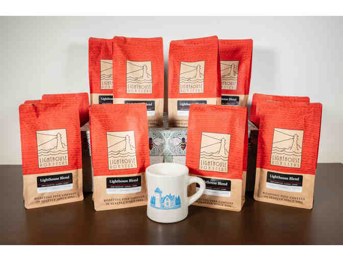 Drink some west coast roasted coffee in an east coast lighthouse coffee mug...Includes 12 bags of Lighthouse Roasters "Lighthouse Blend" whole bean coffee!