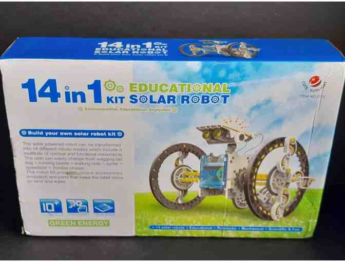 Calling all builders and robot lovers! The 14-in-1 Educational Solar Robot Kit has everything you need to transform a solar-powered motor into 14 different custom bots. Learn basic concepts behind alternative energy and engineering while creating amazing motorized machines. From bugs and boats to a dog with a wagging-tail and a zombie chaser, each build-it-yourself robot is activated by one of the best alternative energy sources: the sun.