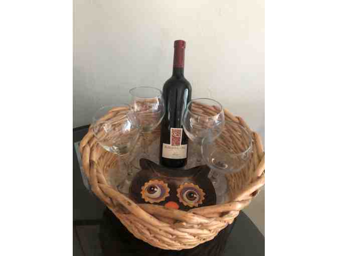 You are bidding on a 2019 bottle of Athene wine from the Borrowing Owl Estate Winery along with four wine glasses, and an owl candy dish. All included with a wonderful basket.