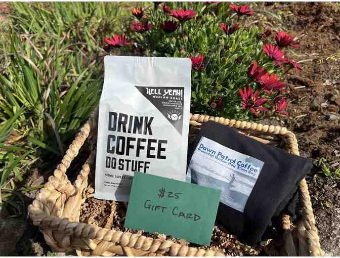 Enjoy the best of Coastside coffee shop Dawn Patrol with 11 oz of whole bean coffee, a $25 gift card and a Dawn Patrol t-shirt.
