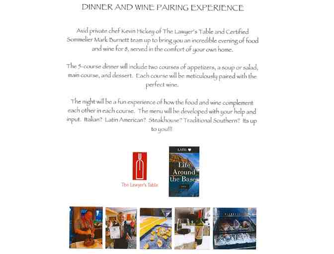 Avid private chef Kevin Hickey of the Lawyer’s Table and Certified Sommelier Mark Burnett team up to bring you an incredible evening of food and wine for 8, served in the comfort of your own home.