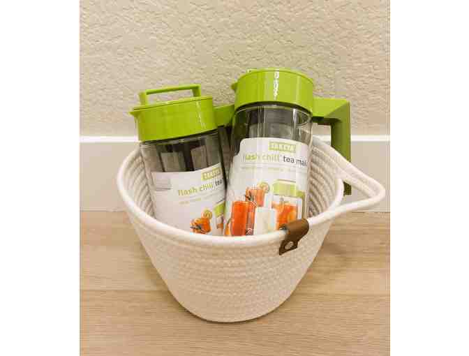 This cute basket contains 2 Takeya Premium Quality Iced Tea Makers with Patented Flash Chill Technology,BPA Free, 1quart each in the color avocado!