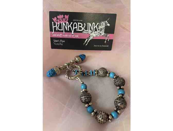 Fun and lovely, this bracelet features a toggle fastener. From the Hunkabunk shop, "Cool stuff made out of junk."