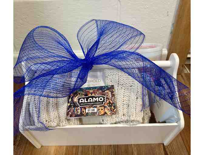 The Movie Night basket features treats for a cozy home movie experience, plus a gift card to go out and see a movie in the theater. Value $100