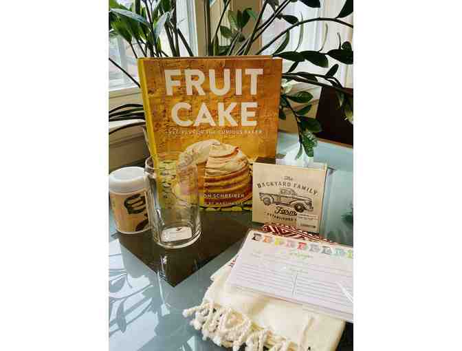 Up for bid is a goodie bag containing: Sencha loose leaf tea, a tea towel, recipe cards, Square Matches, "Fruit Cake" cookbook, and a racoon can glass.